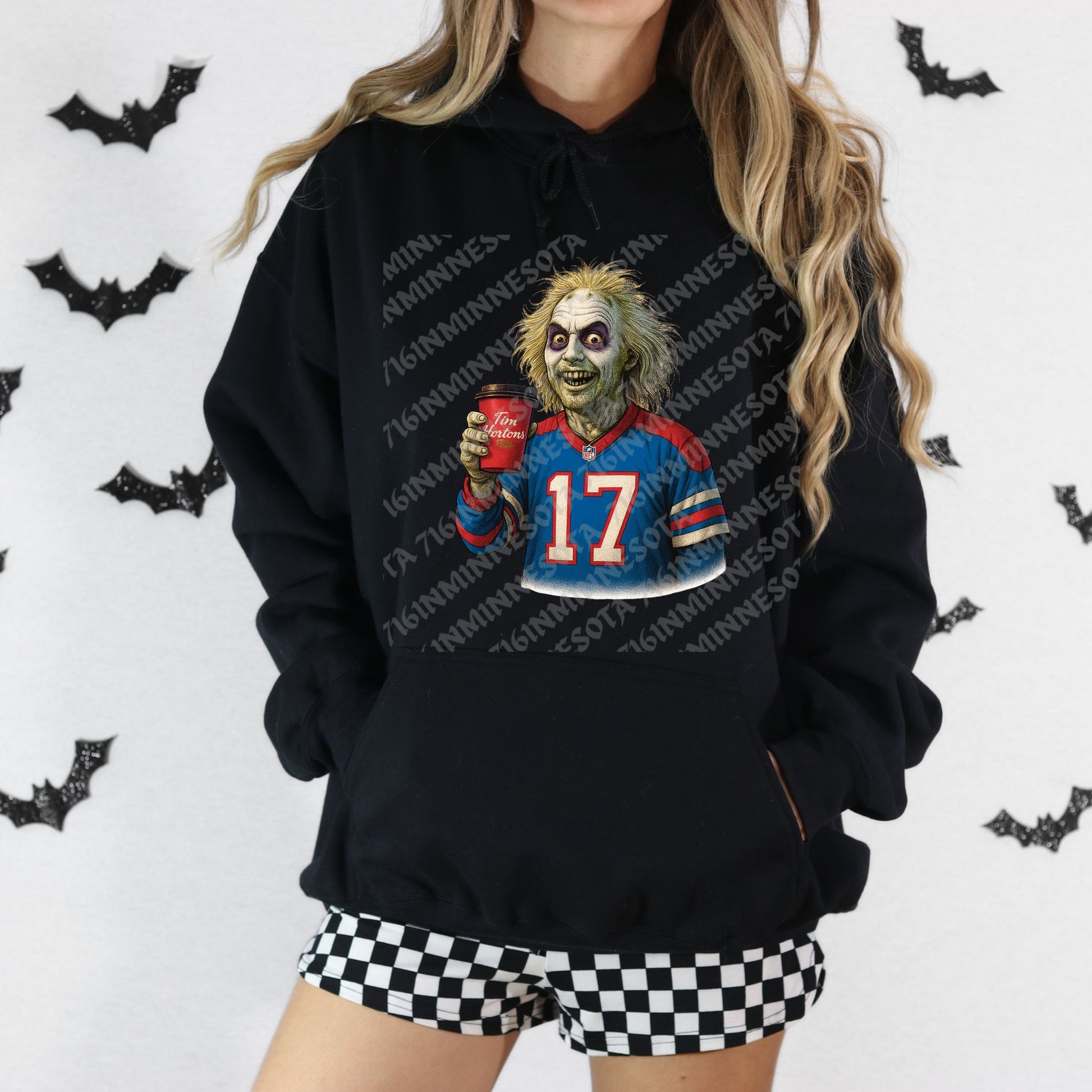Beetle Guist rolls up in full tailgate mode—jersey on, cup in hand, and Buffalo bats flying. This hoodie blends spooky charm with sports swagger, stamped with Buffalo pride and ready for haunted game days.