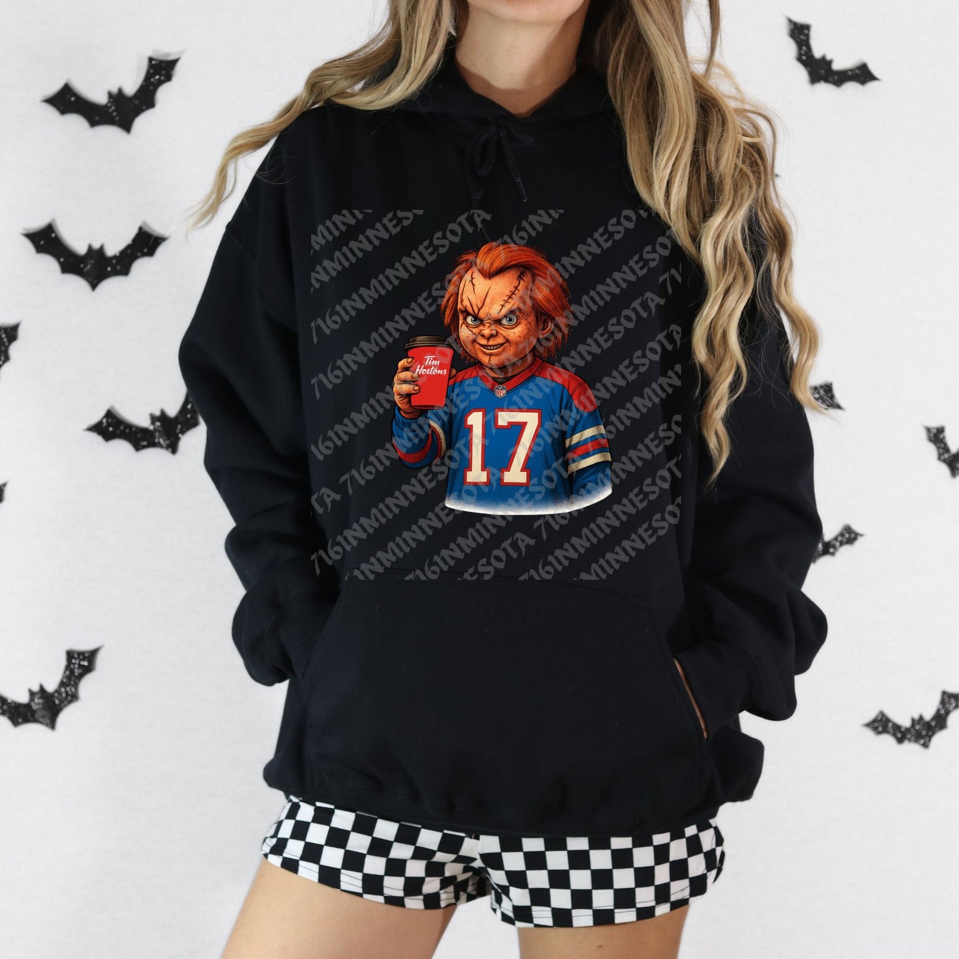 Buddy’s out of the toy box and into the tailgate. This hoodie features the iconic troublemaker in a blue jersey, drink in hand, ready to stir up chaos in Buffalo. A must-have for horror lovers with game-day spirit.