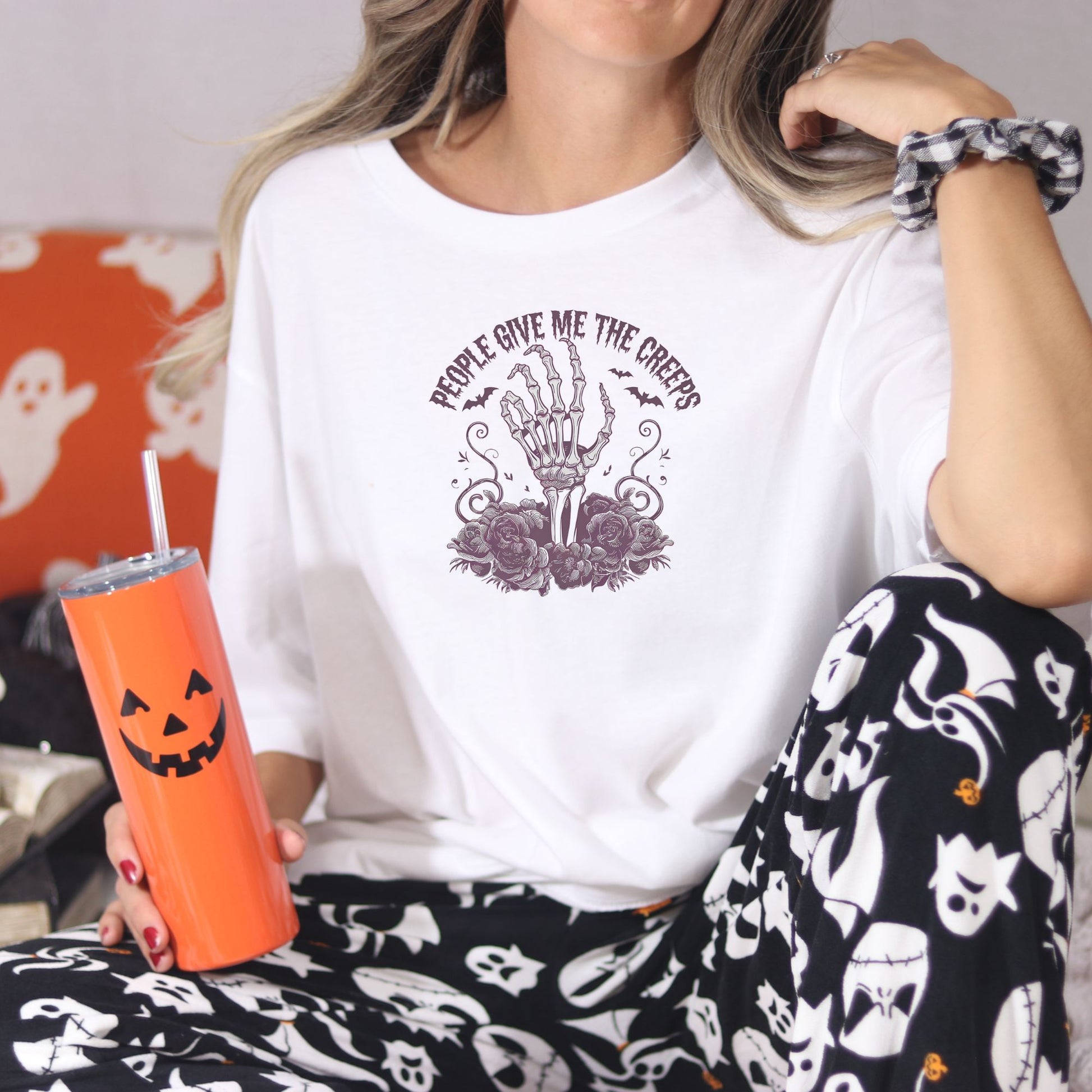 This Halloween tee is for the ones who smile through the nonsense, set boundaries like a boss, and know that not all creeps come with fangs. Featuring a skeletal hand flashing the peace sign from a bed of dark roses, this shirt is your seasonal armor against emotional vampires and chaotic energy.